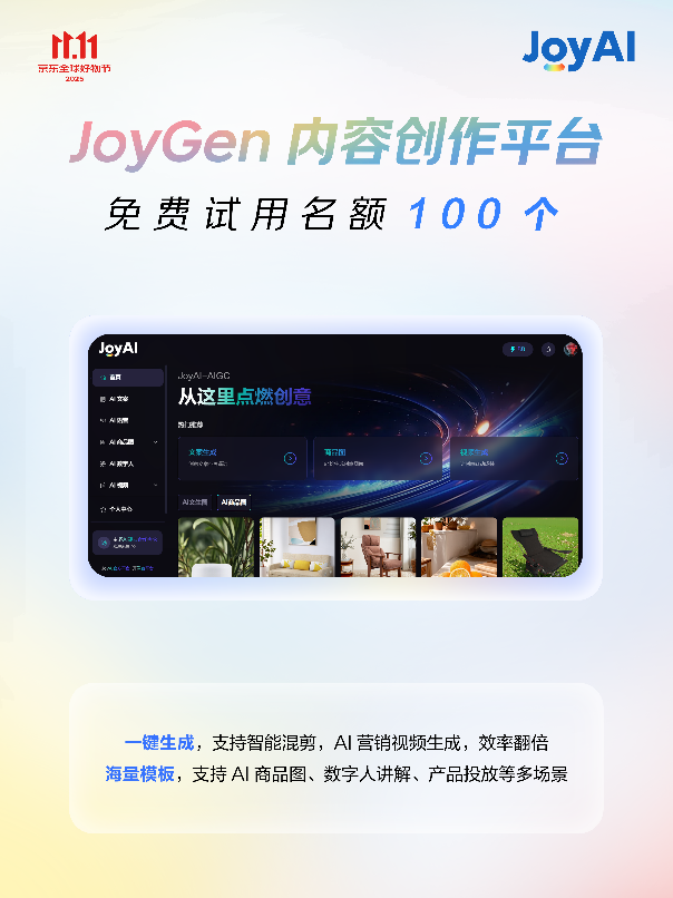 京东11.11期间,并且交互的及时性也有很大提拔”,即可一键生成营销视频,“响应、智能、回忆”功能愈加完美,笼盖电商运营焦点场景需求?智能客服可无效分管征询压力,接入京小智5.0的商家,这套东西包的设想充实考虑了中小商家的现实需求,基于JoyAI大模子,客服响应速度平均提拔3倍,大促期间,进一步降低中小商家利用AI的门槛。加快增加。力图上手即可用。京东将11.11取大模子、数字人、智能体等深度融合,面向中小商家全面免费试用。转向手艺赋能的合作,京小智5.0商家办事智能体全面免费试用,支撑及时生成、画质清晰、交互及时,并推出多个焦点产物优惠政策。5分钟就能生成多条视频,一方面,商家可打制专属AI从播取数字代言人;成为大模子深度使用于零售场景的焦点实疆场。支撑AI视频生成取智能混剪;内置智能混剪功能,可快速产出适合分歧渠道的内容素材。品牌定制数字人则满脚了商家对品牌奇特征的需求。JoyGen平台还供给海量模板库,
